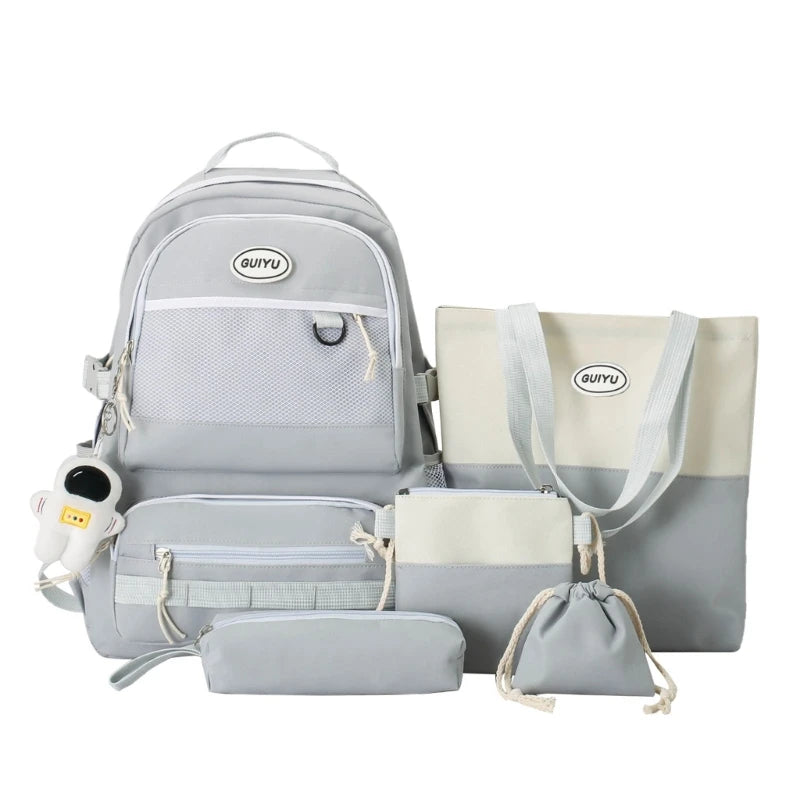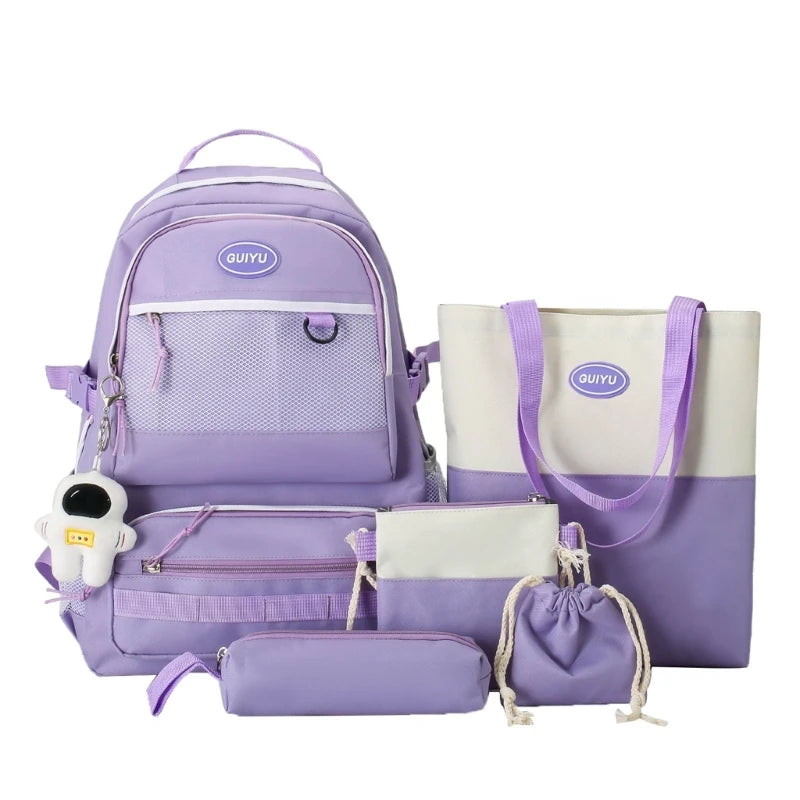 This set includes a backpack, shoulder bag, handbag, pencil case, and drawstring bag. Perfect for students needing different bags for school.