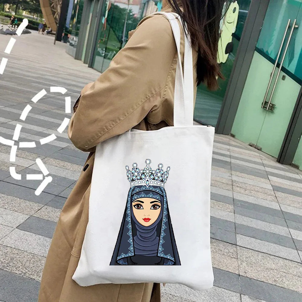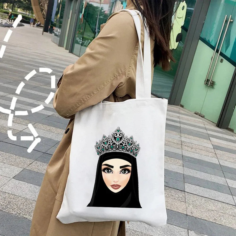 This stylish canvas handbag features a beautiful Arabic woman with a crown, hijab, and face cover. Perfect for Muslim women looking for a fashion accessory that celebrates their culture and beliefs.