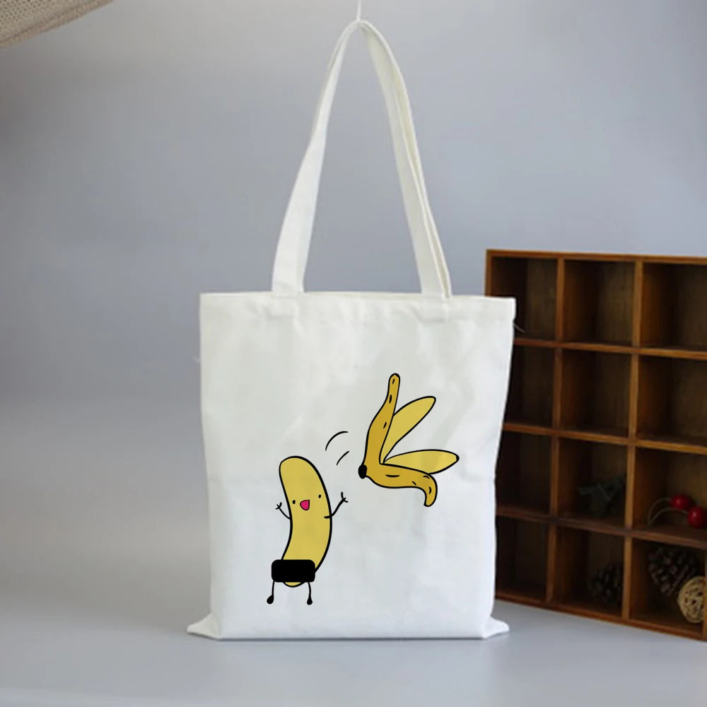 This canvas tote bag features a humorous print of a banana disrobing. The perfect accessory for shopping or everyday use.