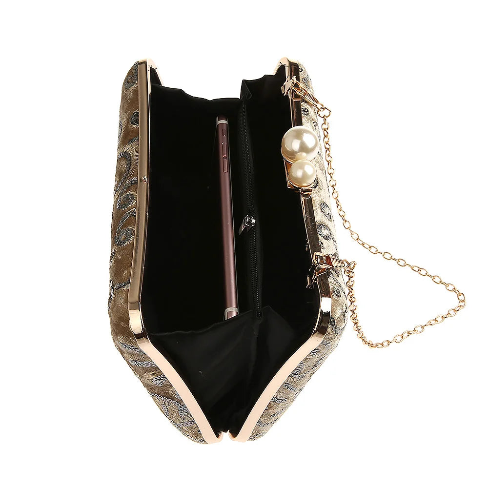 This elegant evening bag features delicate beads and diamond sequins, perfect for weddings or parties. It comes with a chain strap for versatile carrying options.