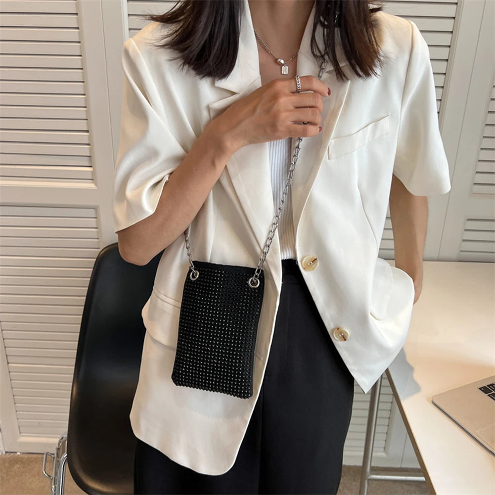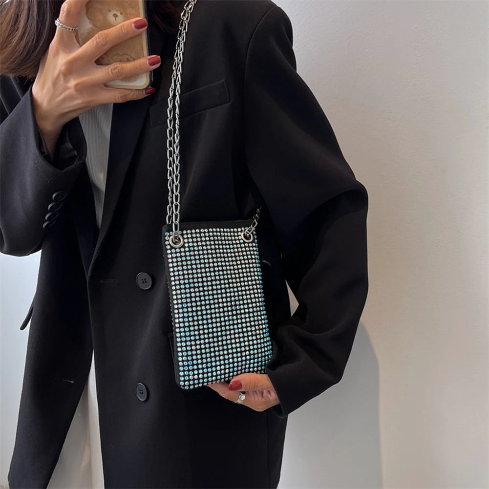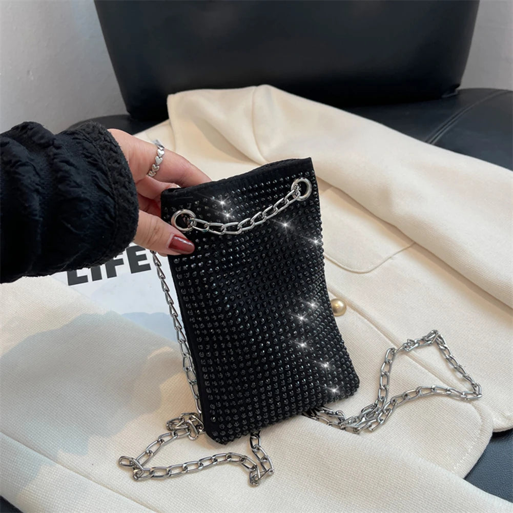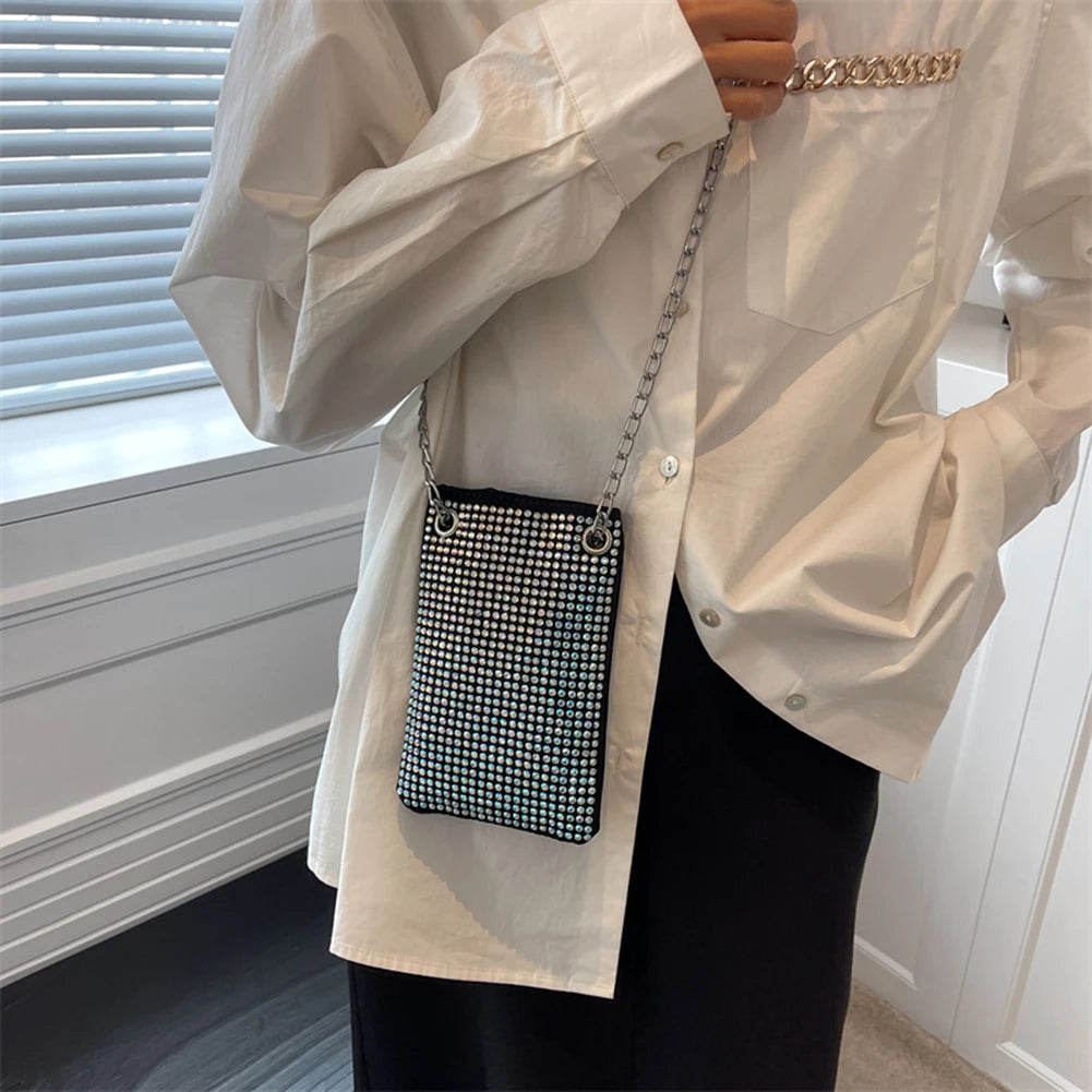This dazzling phone bag features rhinestone detailing and a small size perfect for evening events. It can be worn as a crossbody handbag or shoulder messenger bag.