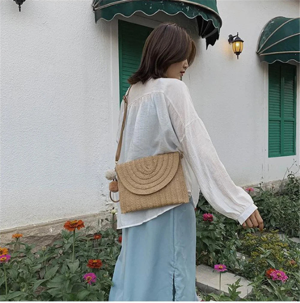 Elevate your summer style with this chic Bohemian woven crossbody envelope bag. It features a trendy pendant and can double as a clutch or shoulder bag for beach outings.