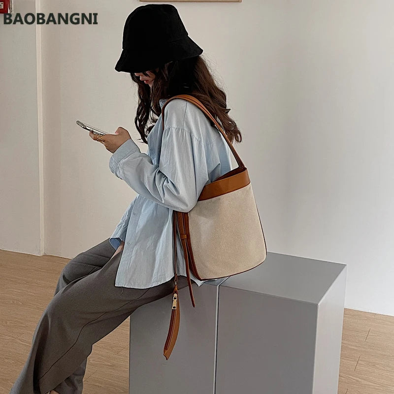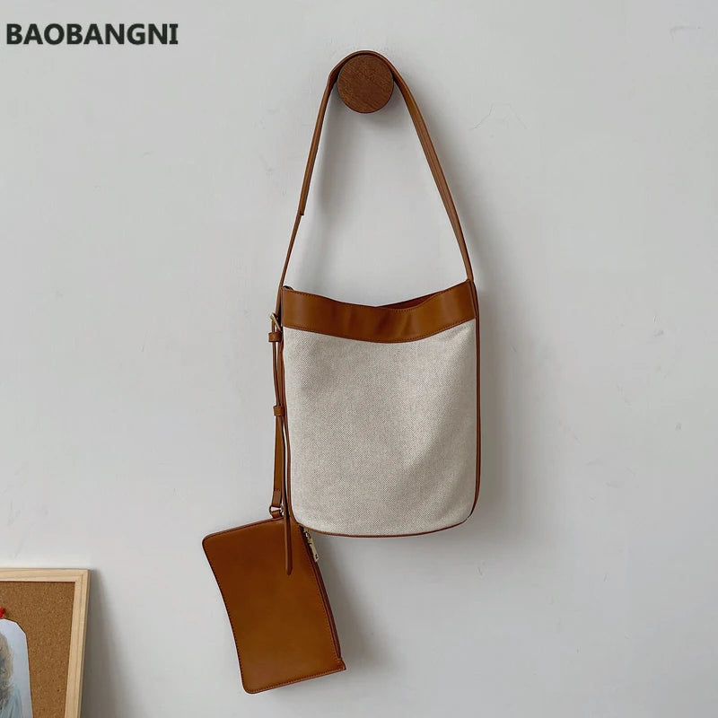 Canvas PU Leather Ladies Bucket Bag Shoulder Crossbody Bag