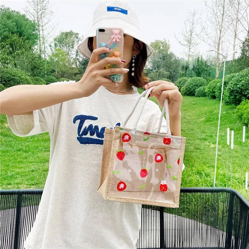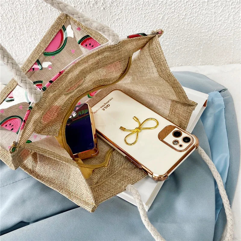 This cute and trendy canvas handbag features a transparent design with fruity accents. Perfect for adding a fun touch to your outfit!