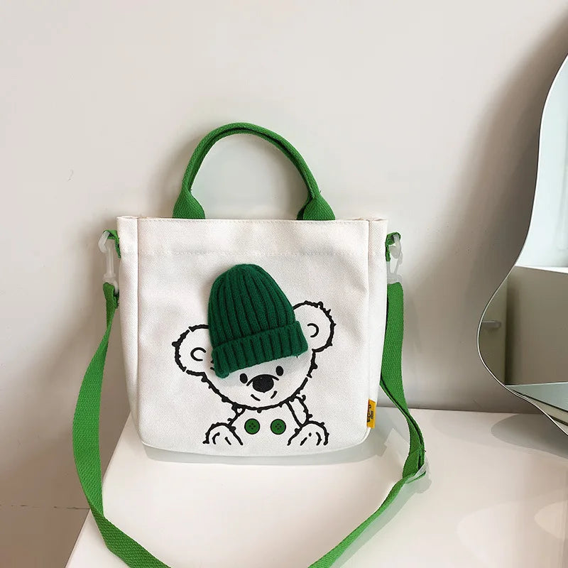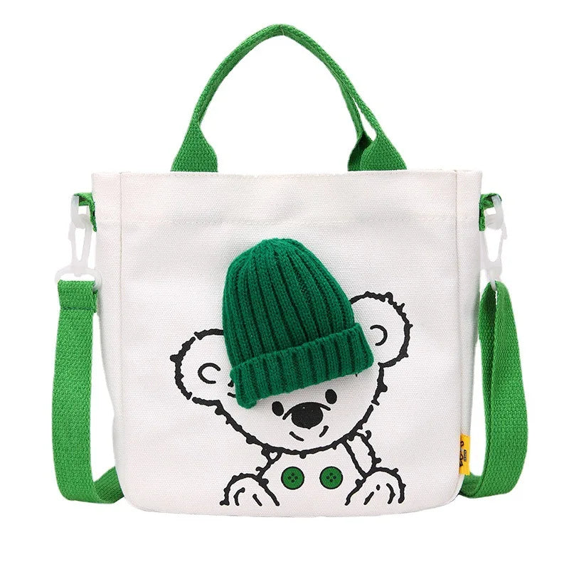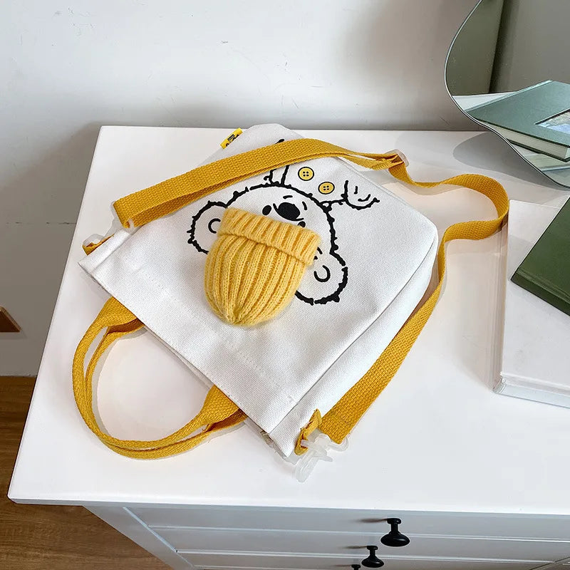 This canvas shoulder bag features a cute cartoon bear print, perfect for students or casual outings. It's a creative and practical accessory.
