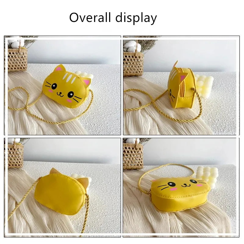 Adorable PU leather shoulder bag for baby girls featuring a cute cartoon cat design. Perfect for carrying small items like coins and cards. Ideal gift for children.