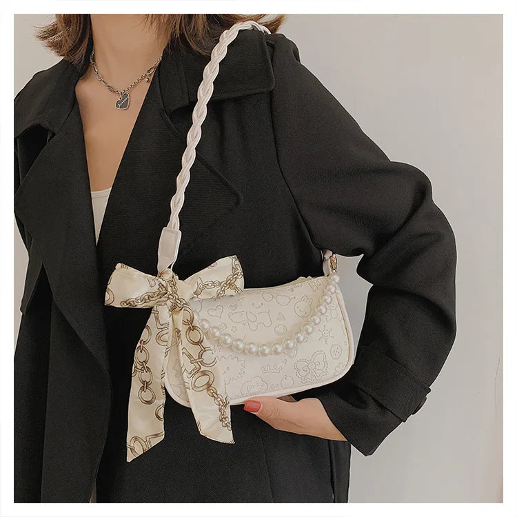Stay stylish with this classic shoulder bag featuring a cute cartoon pattern and letter print, complemented by a silk scarf. Perfect for any occasion.