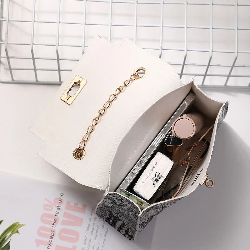 This small square bag is perfect for carrying your essentials. It features a chain strap and can be worn as a shoulder bag or crossbody bag.