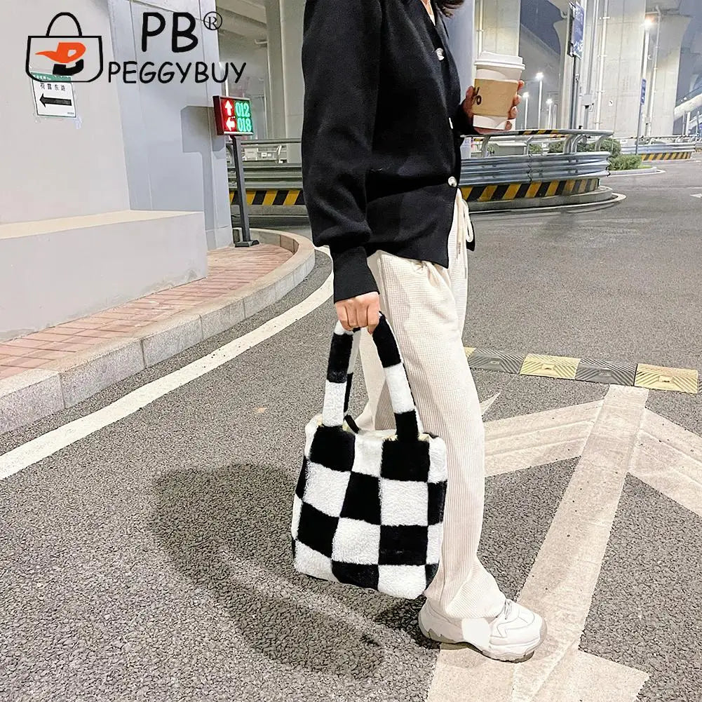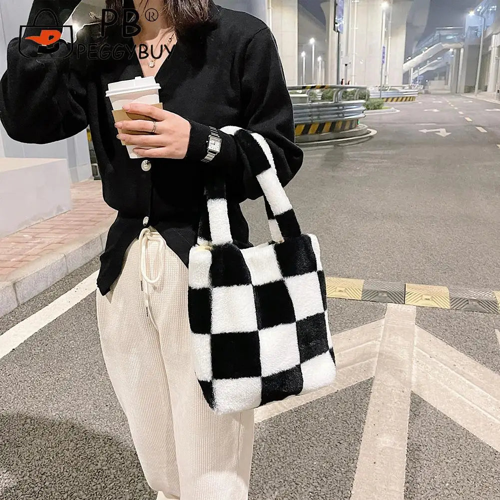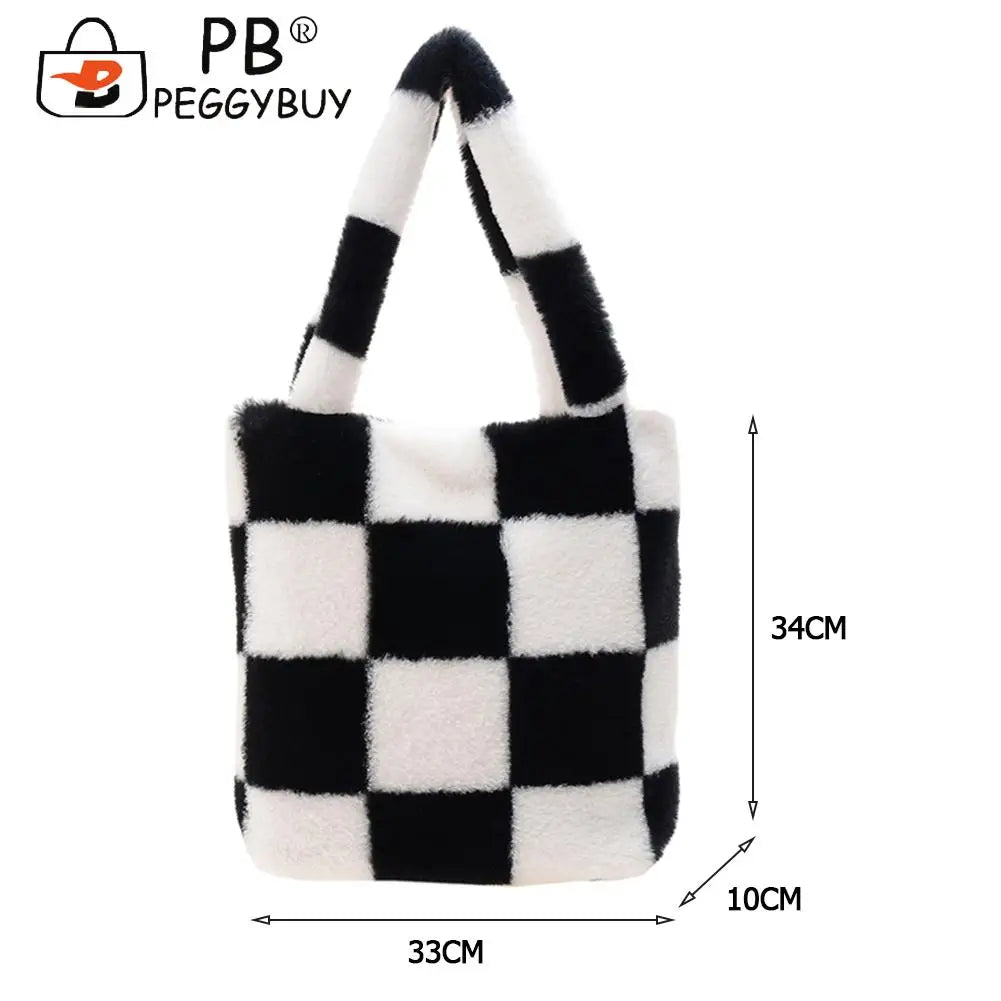 Stay stylish and organized with this checkered printing shoulder underarm bag. Made of soft plush material, perfect for autumn and winter seasons.