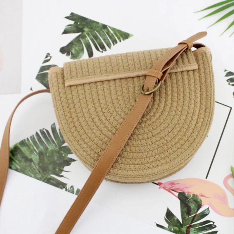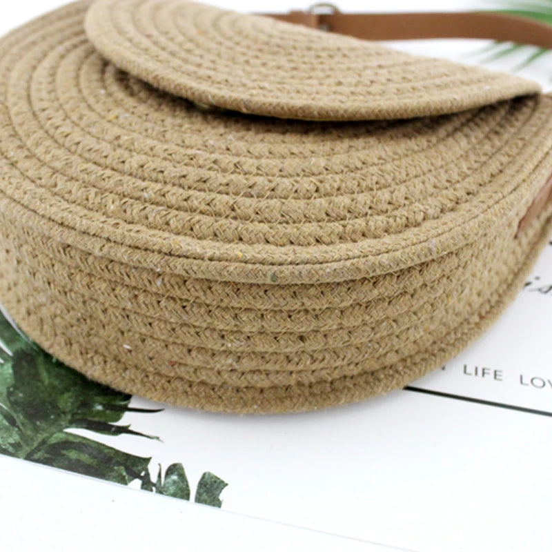 This woven clamshell bag is perfect for a casual day out. It features a compact design and can be used as a shoulder bag or messenger bag.