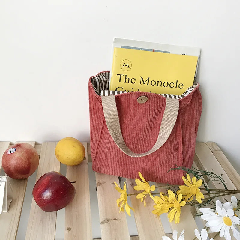 Stay stylish with this corduroy canvas lunch bag that is perfect for picnics, featuring a thickened design and cotton cloth material. Ideal for food storage and suitable for ladies.