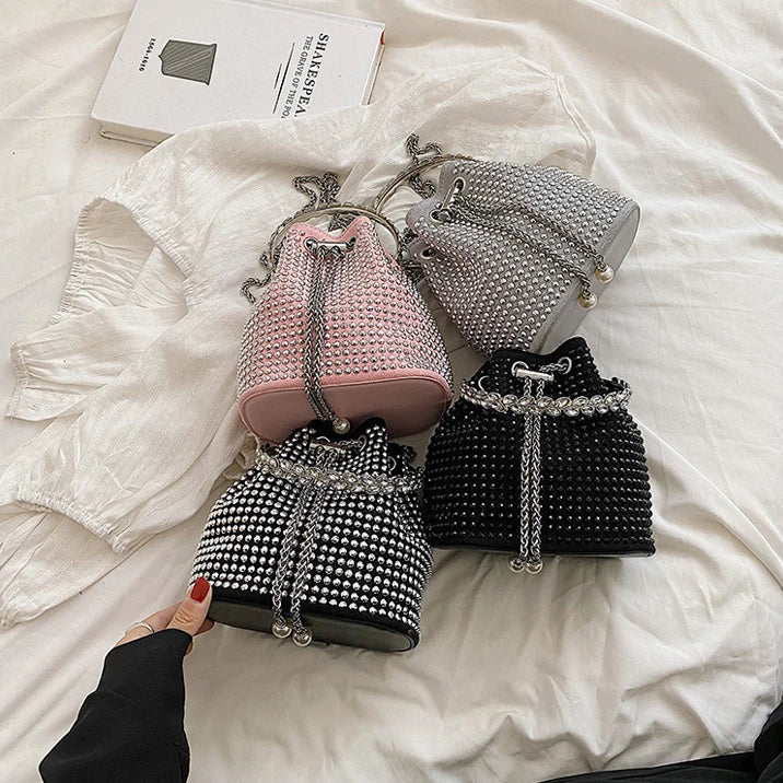 This stunning drawstring bucket bag features diamonds inlay design, perfect for summer outings and banquet events.