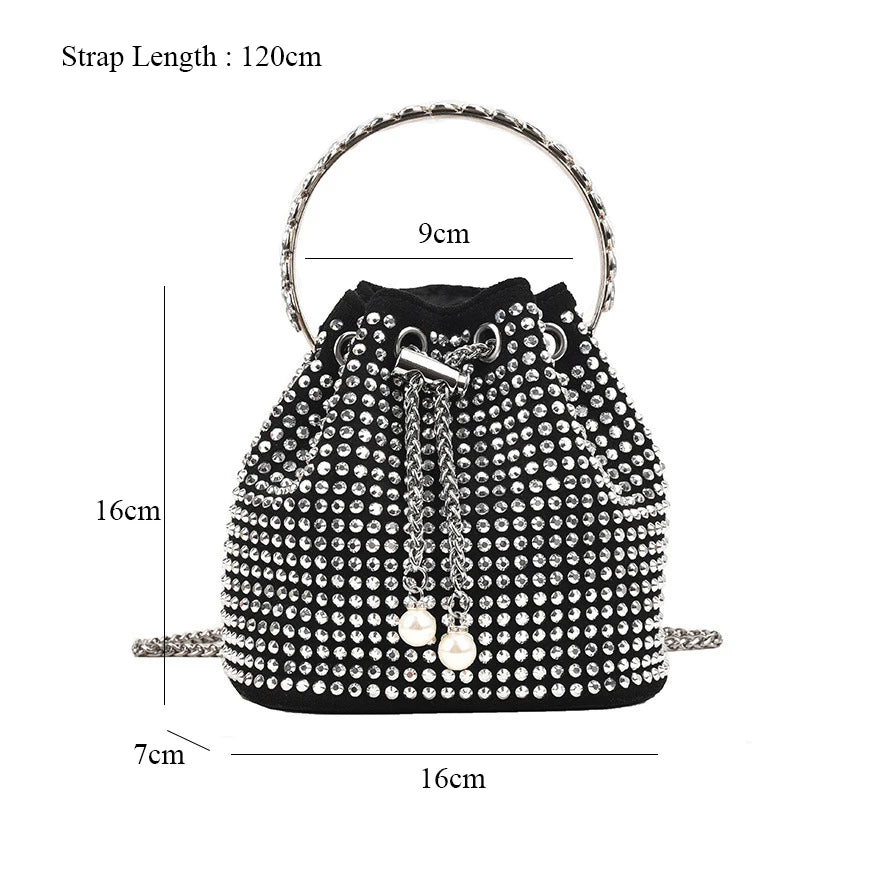 Description:This stunning drawstring bucket bag features diamonds inlay design, perfect for summer outings and banquet events.Features: Diamonds inlay design for a glamorous look Drawstring closure for easy access Ideal for summer and banquet occasions Metal handle adds a touch of elegance Comes with a chain shoulder strap for versatile wear...