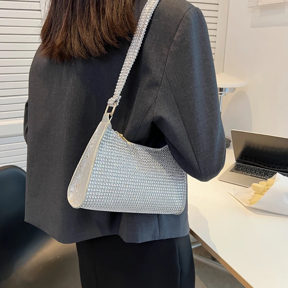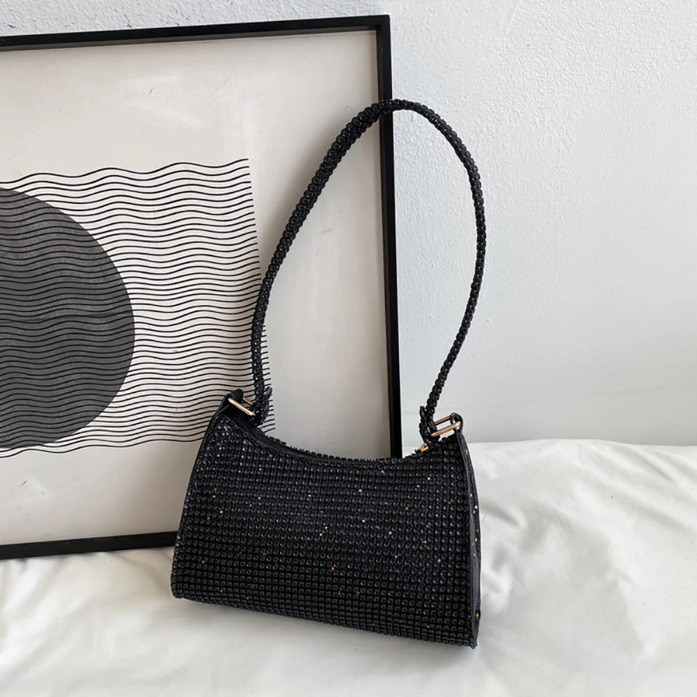 Elegant and stylish shoulder bag featuring rhinestones, perfect for parties, evening events, or travel. Comes with a zipper closure and can be used as an underarm purse.