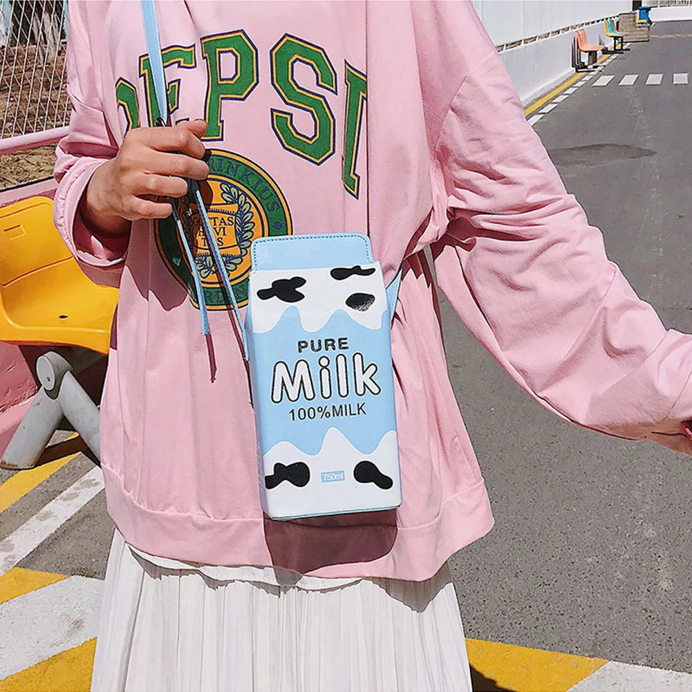 Stay stylish with this adorable handbag featuring a fun banana milk box design. Perfect for ladies and girls!
