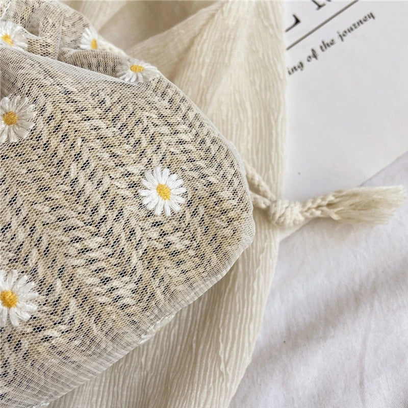 D0LF Flower Straw Bag Drawstring Bucket Bag Woven Shoulder Bag