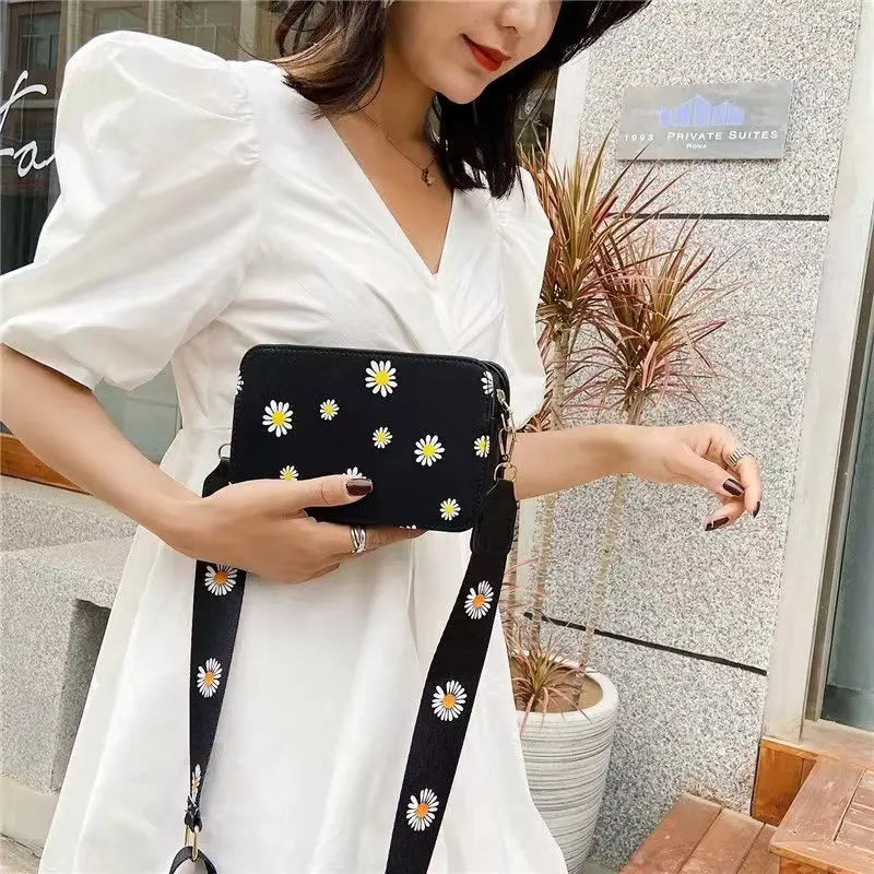 This fashionable shoulder bag features a sweet daisy pattern, candy handle, and phone pocket. Perfect for teenager girls to carry their essentials in style.