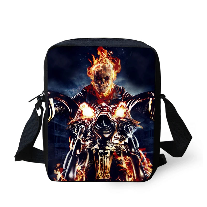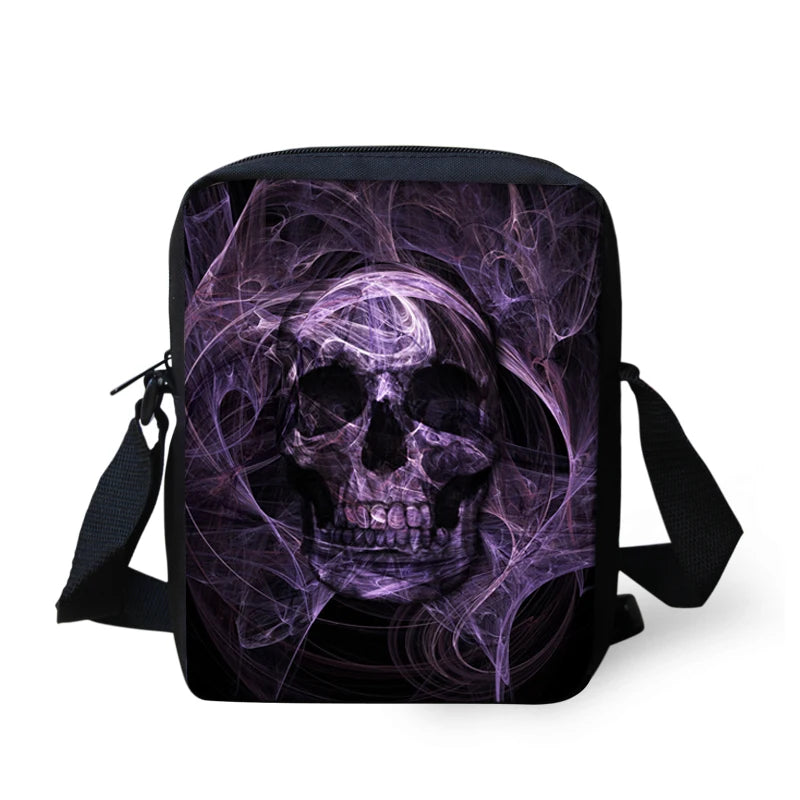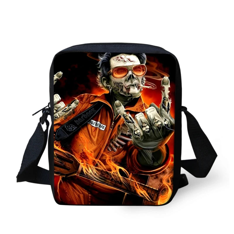 This stylish messenger bag features a dark skeleton print, perfect for students and casual outings. It can be used as a shoulder bag or cross-body satchel.