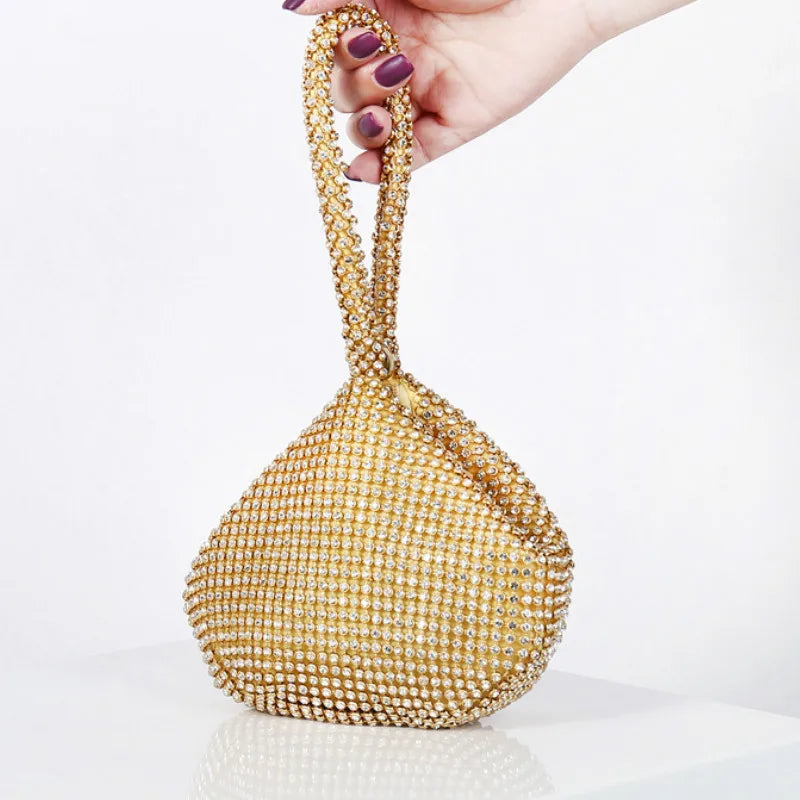 Add elegance to your evening outfit with this stunning diamond-studded clutch bag. Perfect for a night out or special event.