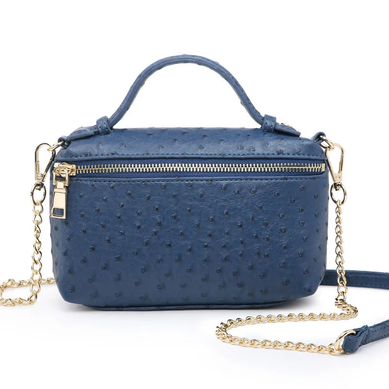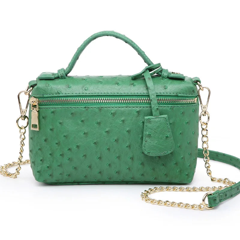 This stylish clutch bag features genuine ostrich leather and a chain strap. Perfect for adding a touch of luxury to any outfit.
