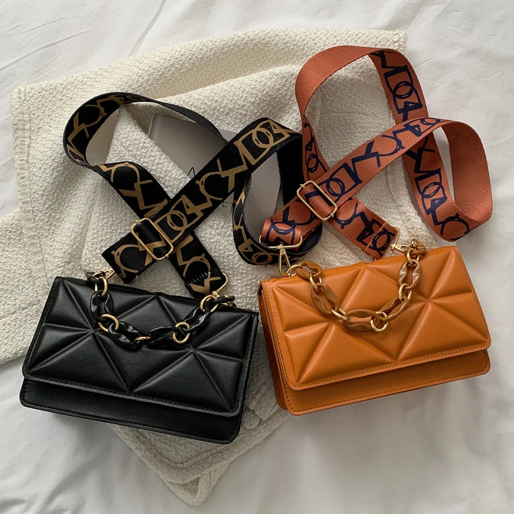 Embossed Chain Shoulder Bag Wide Strap Flap Messenger Bag