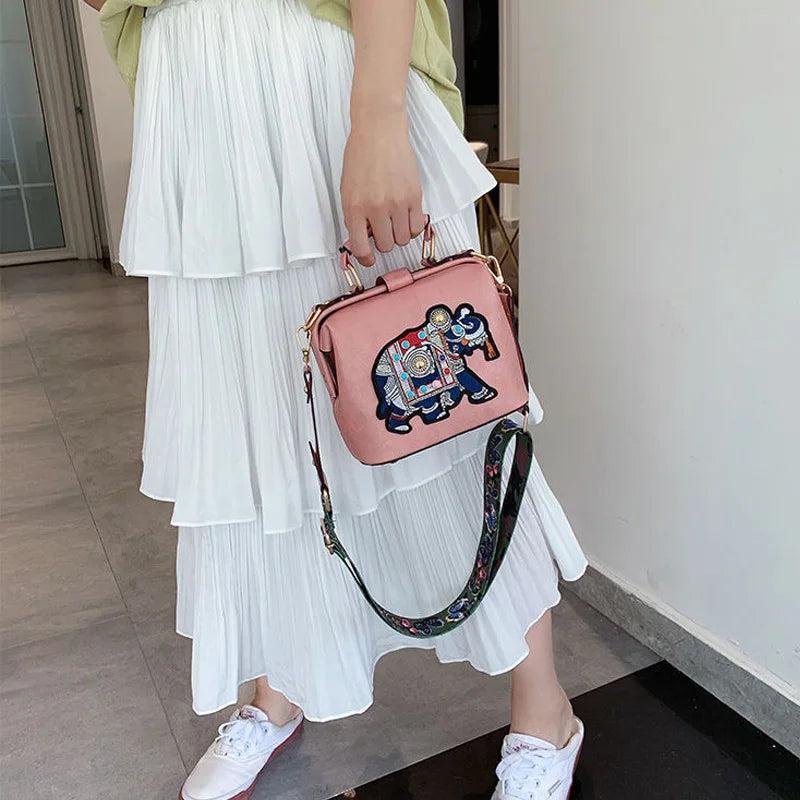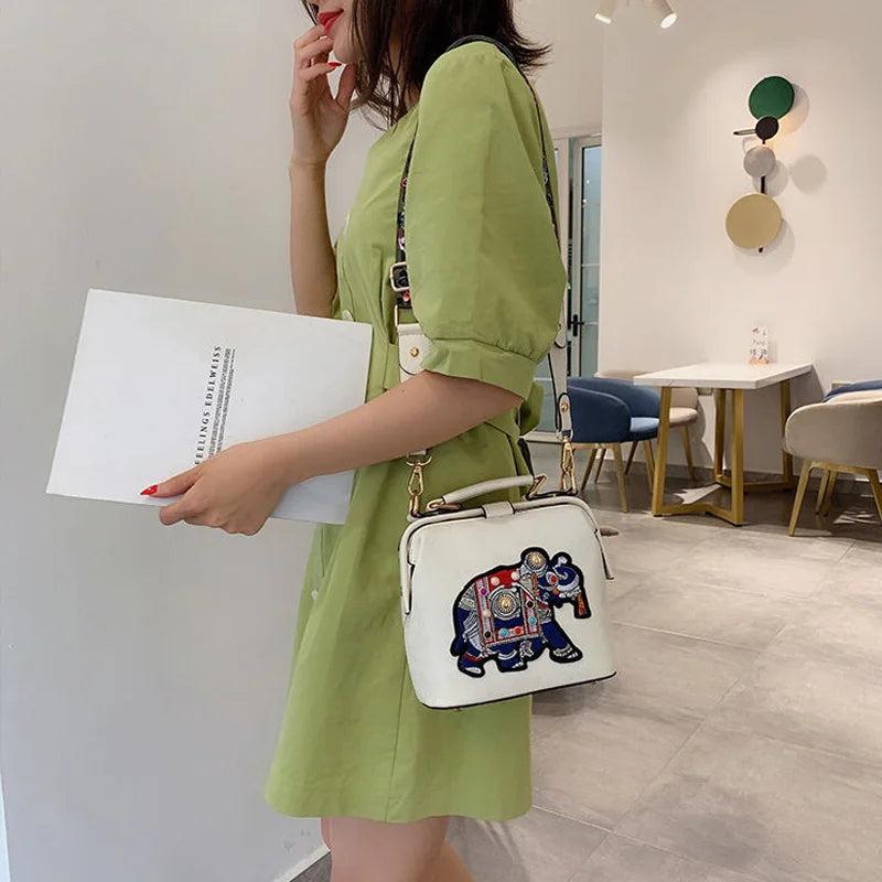 This handbag features a unique embroidered elephant pattern design on PU material, perfect for casual use. It can be worn as a one-shoulder or messenger bag.