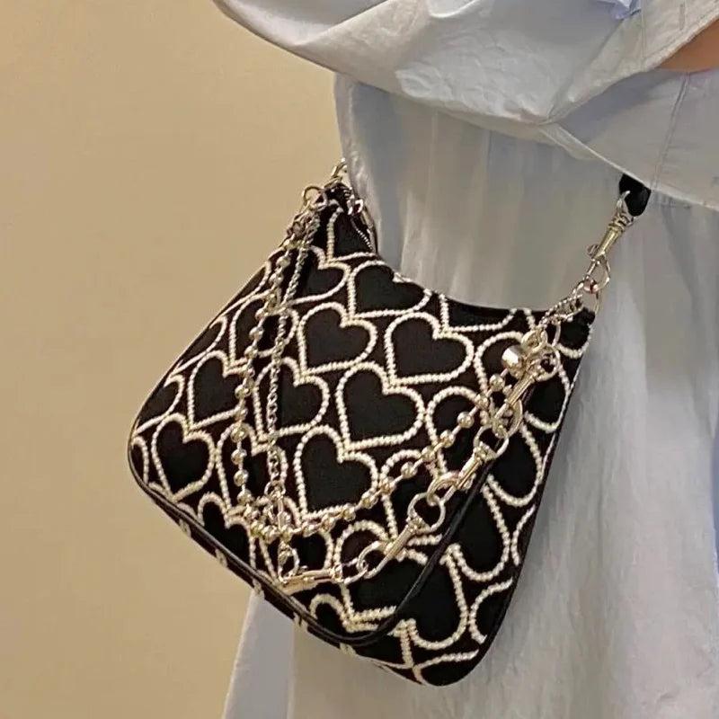 This heart shape embroidered shoulder bag is perfect for a gothic look. Made of durable canvas, it complements any outfit.
