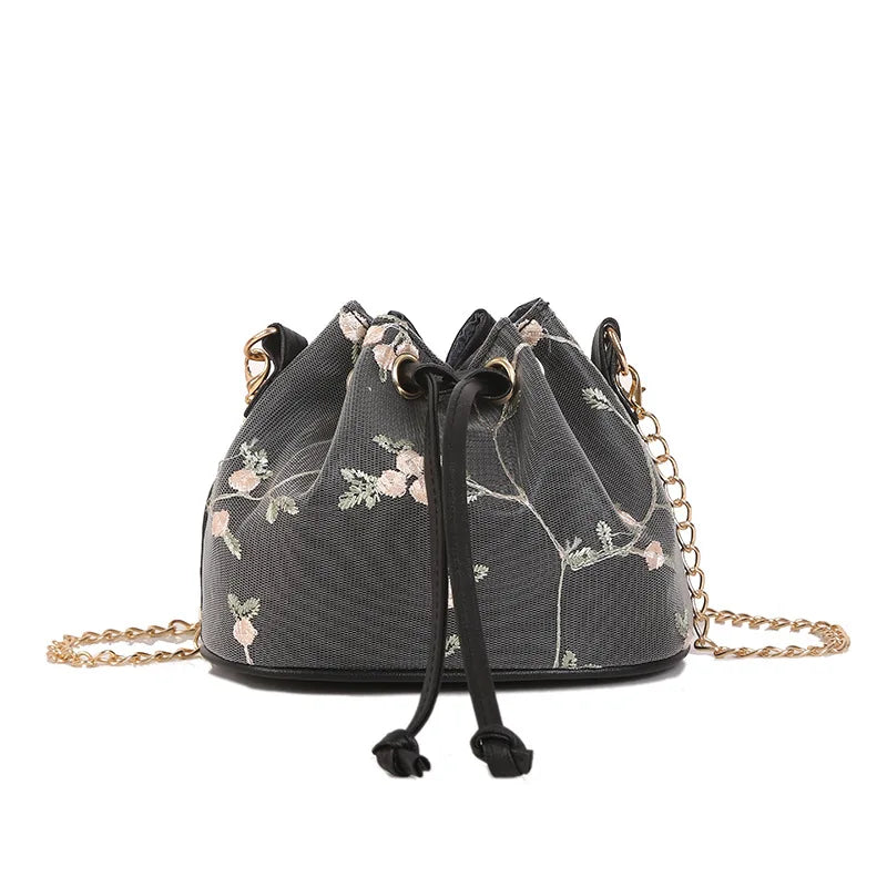 This stylish crossbody bag features intricate lace embroidery, a drawstring closure, and a comfortable shoulder strap. Ideal for daily use or special occasions.
