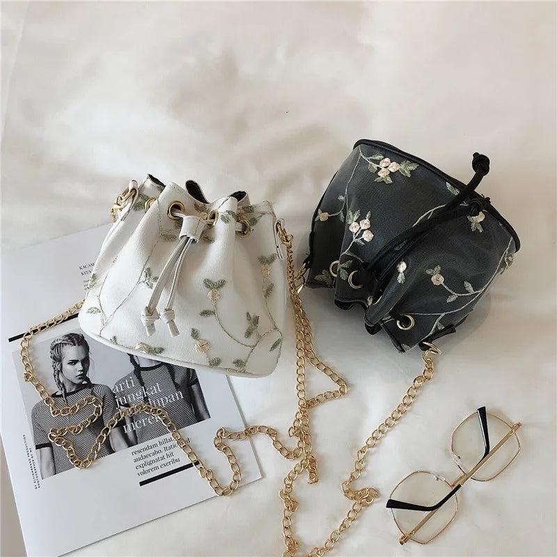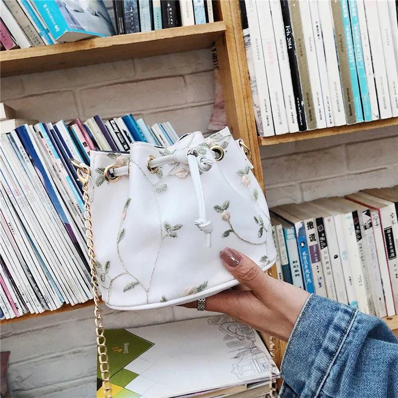 This crossbody bucket bag features delicate embroidery and a drawstring closure. It can be worn as a shoulder bag or a messenger bag, perfect for everyday use.