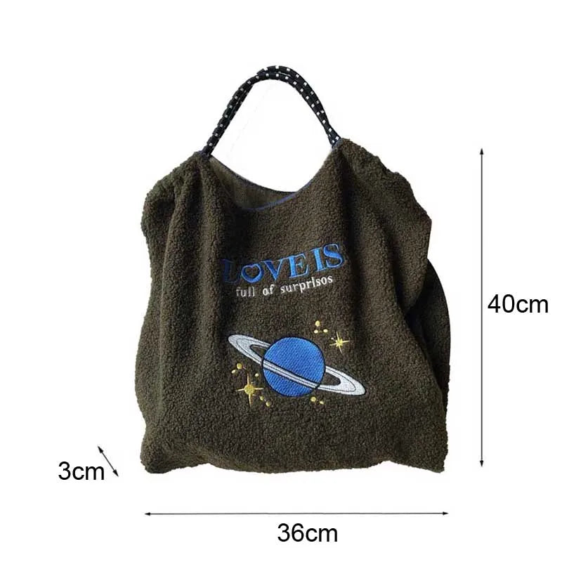 Stay stylish and cozy with this autumn and winter universe embroidered tote bag. Made of lamb wool with a large capacity for all your essentials.