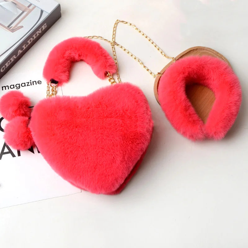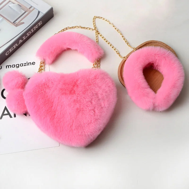 This adorable set includes a heart-shaped faux fur purse and a matching headband, perfect for adding a touch of whimsy to any outfit.