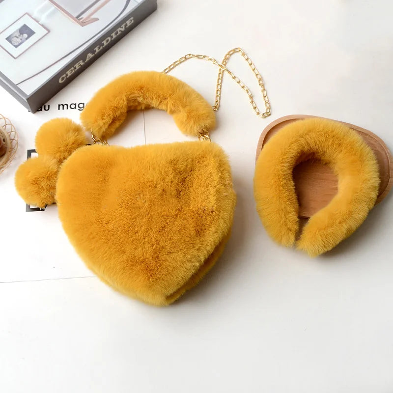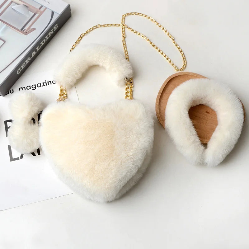 Faux Fur Heart Purse & Headband Set Lady Handbag