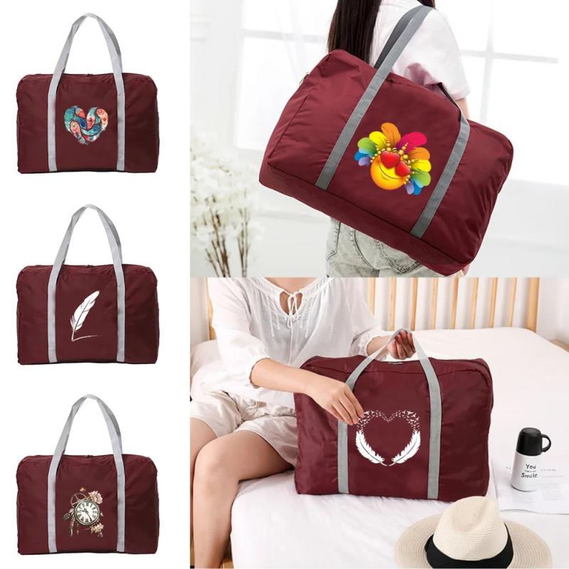 This travel bag is designed for convenience and style. It features a feather series printing, large capacity, and is foldable for easy storage. Perfect for organizing your belongings while on the go.