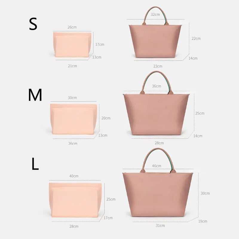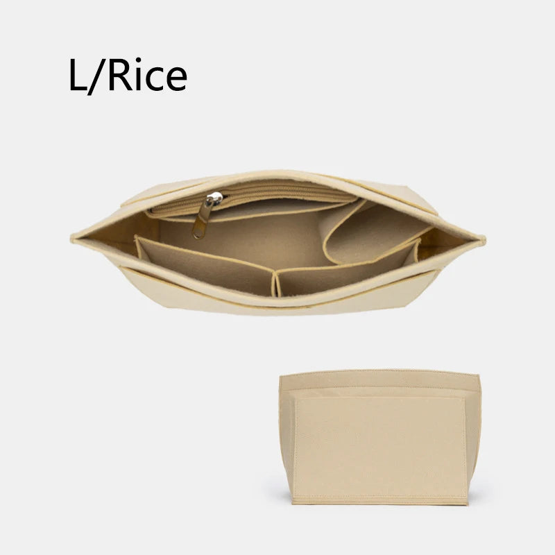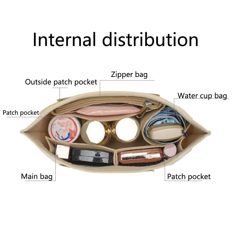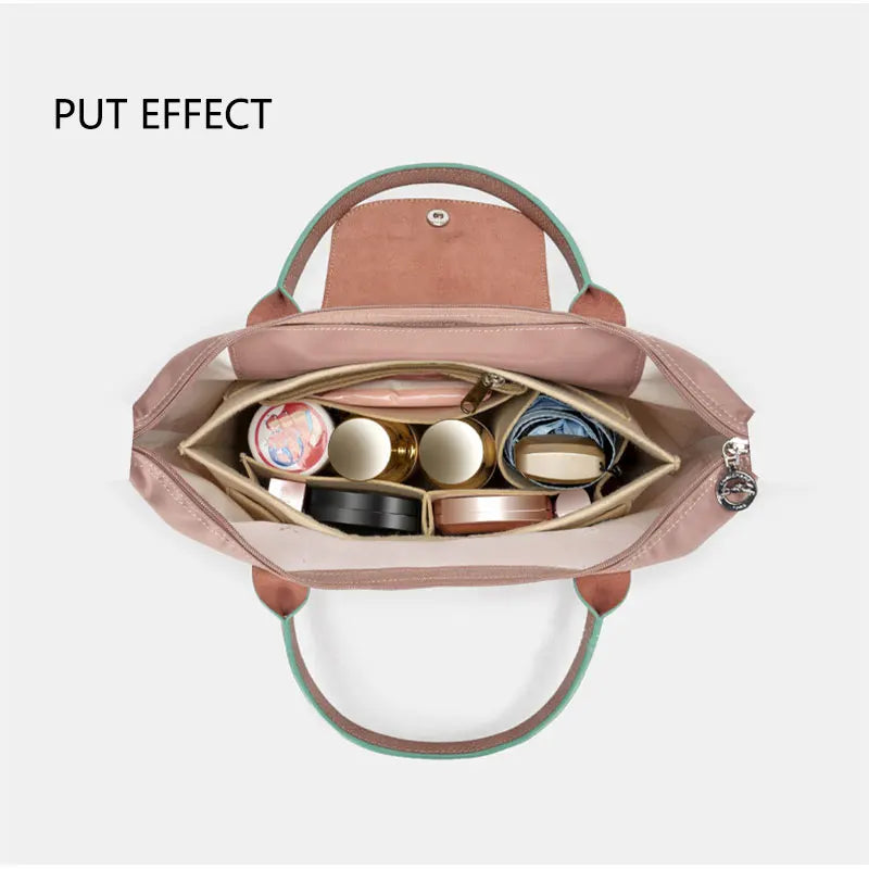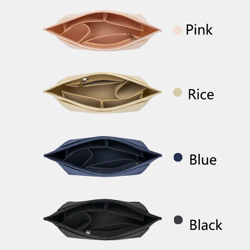 This versatile felt cloth makeup bag liner insert is designed to keep your cosmetics and essentials organized in your handbag. It's perfect for travel and can easily be transferred between purses.