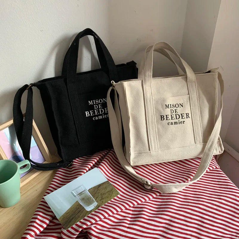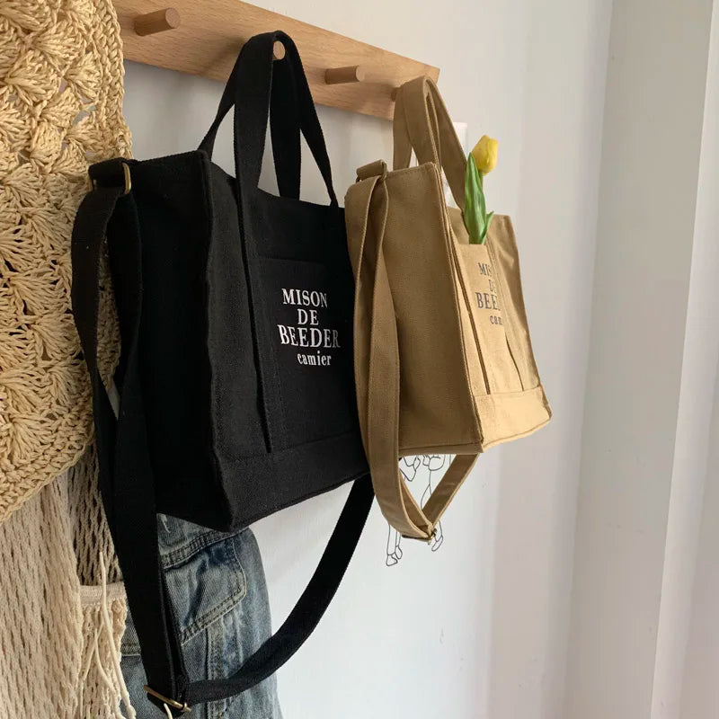 Stay stylish with this trendy canvas handbag perfect for college students. Features letter printing design and long shoulder strap for added convenience.