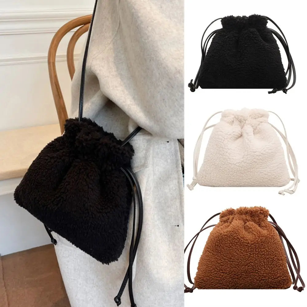 Female Plush Drawstring Shoulder Bag Tote Purse Bucket Bag