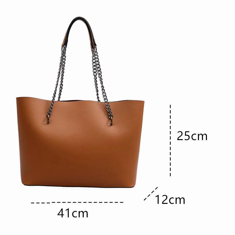 This stylish handbag is perfect for shopping with its large capacity and solid handle design. The chain shoulder strap adds a fashionable touch.
