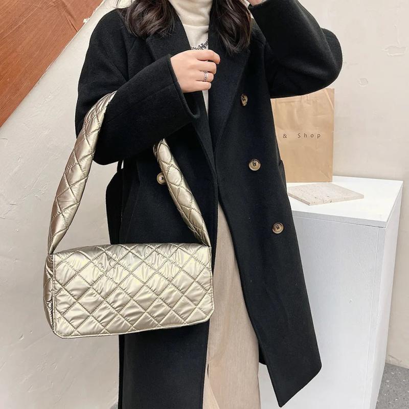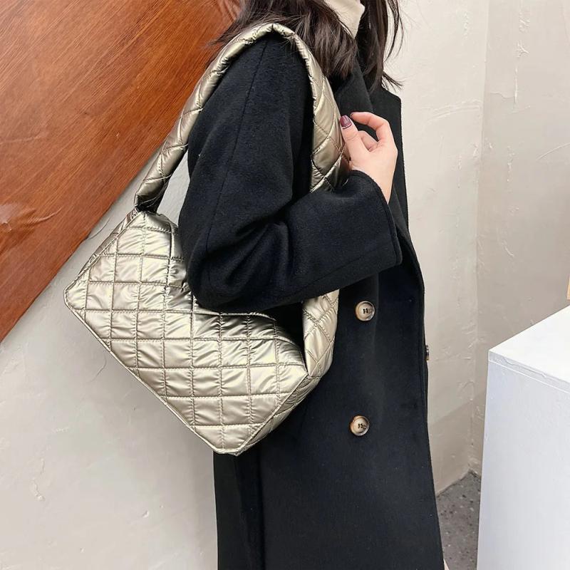 This shoulder bag features quilted padding and a blown bag design, providing a large capacity for all your shopping needs.