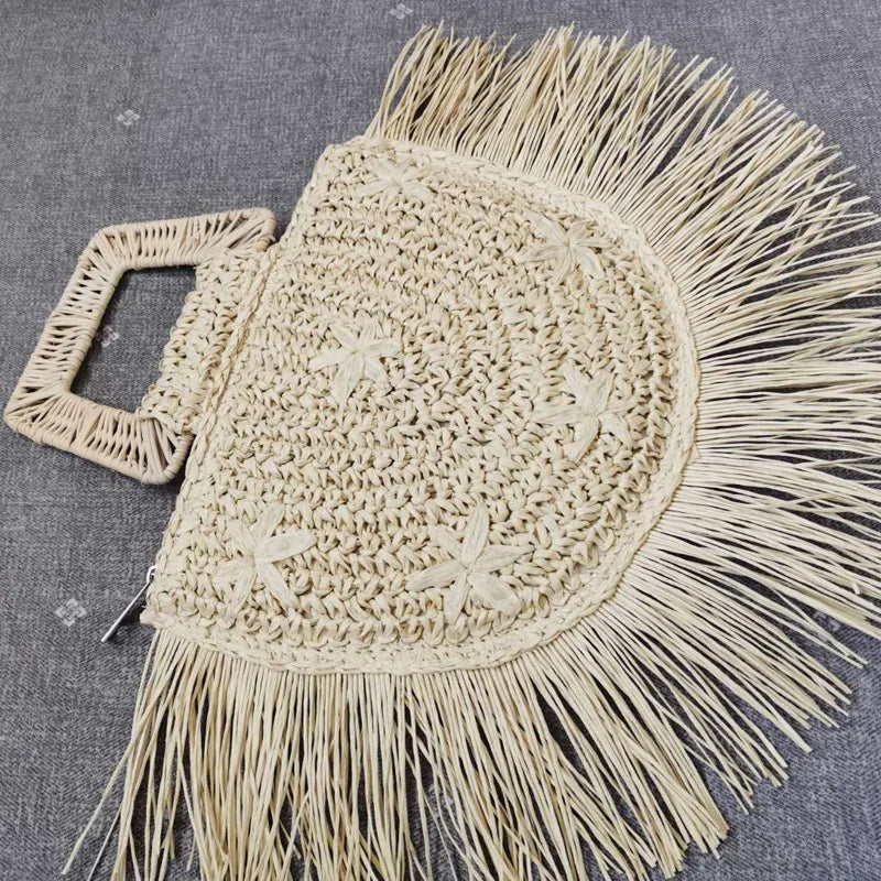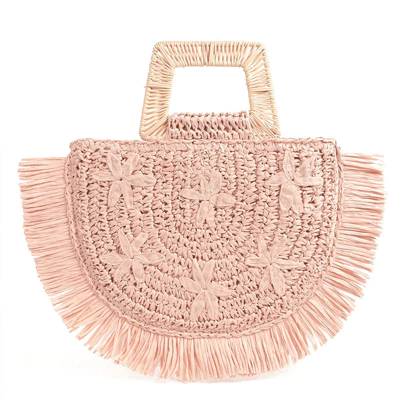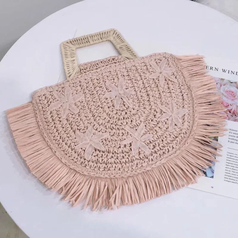 • Charming hand-woven straw bag with flower embroidery and tassel accents