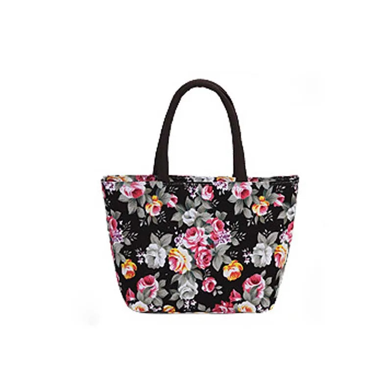 This small canvas handbag is perfect for mothers and makeup storage. It features a beautiful flower pattern design.