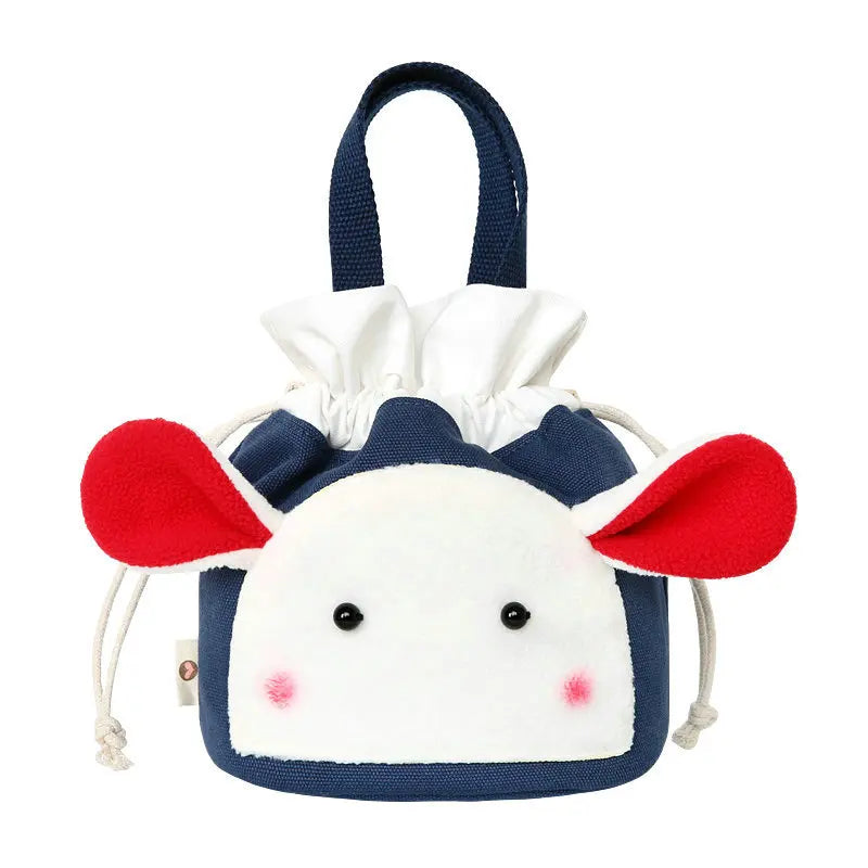This lovely flower storage bag doubles as a cosmetic makeup bag, featuring a drawstring closure. It is perfect for on-the-go use and can also be used as a lunch box. The bag is designed with a cute rabbit and made of durable canvas material.