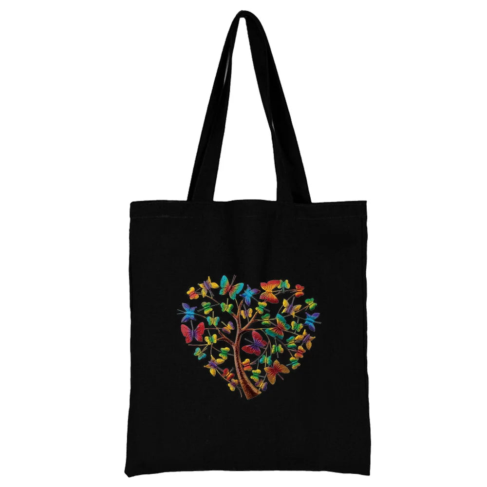 This shoulder bag features a stylish butterfly print pattern, made of durable canvas material, suitable for students or casual outings.