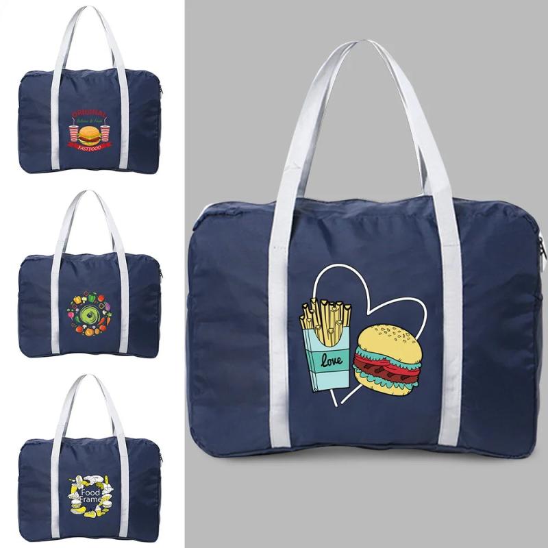 This large capacity storage bag features a fun food print design and is perfect for outdoor travel, yoga, sports, and more. It is waterproof and can be used as a handbag or shoulder bag.