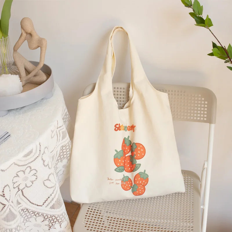 This canvas bag features a fun fruit printing design, perfect for girls and students. It offers a large capacity for all your essentials.