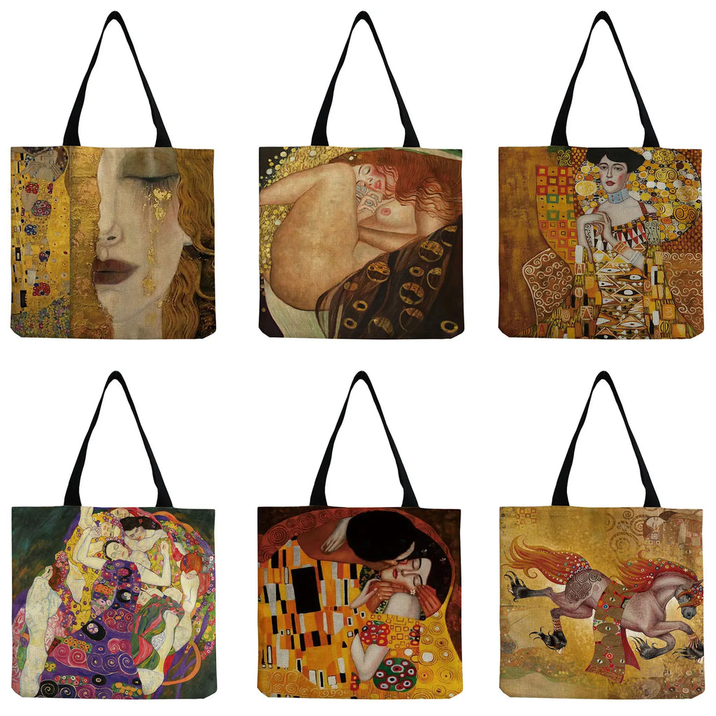 Eco-friendly and reusable tote bag featuring a beautiful oil painting by Gustav Klimt. Perfect for shopping, beach trips, or outdoor activities.