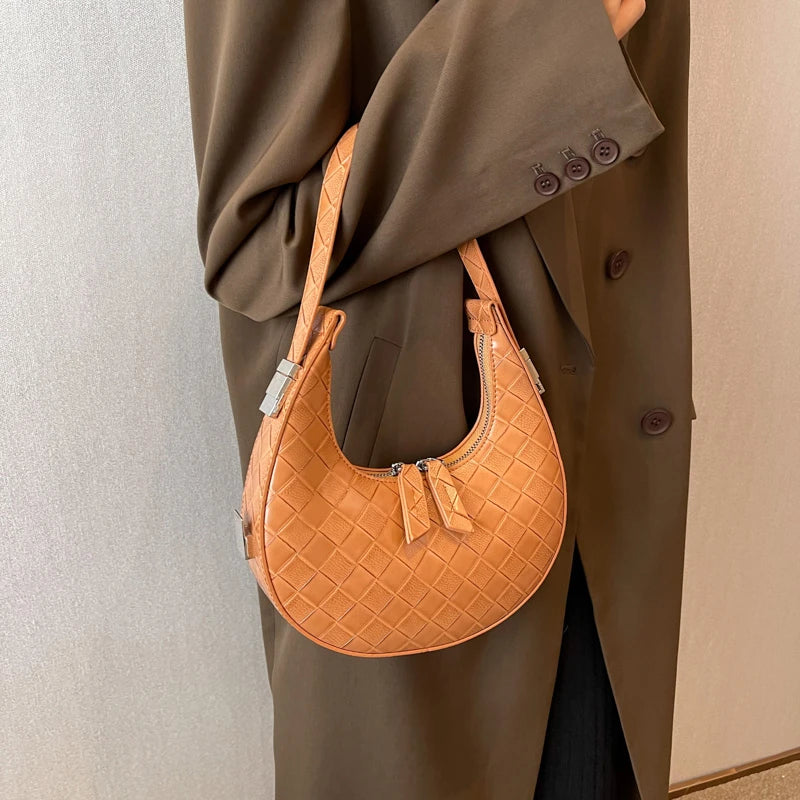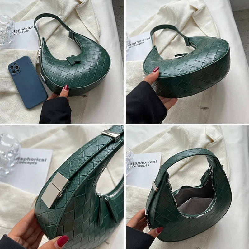 This hobo bag is made of high-quality PU leather with a stylish woven design. It features a half-moon shape and can be used as a shoulder bag or underarm handbag.