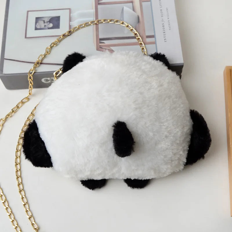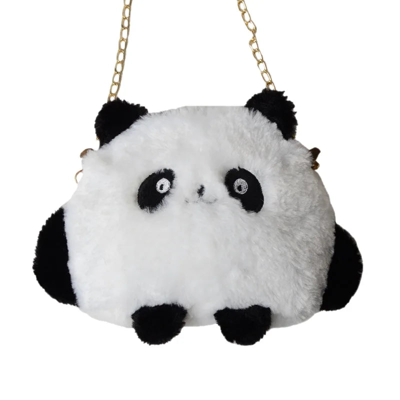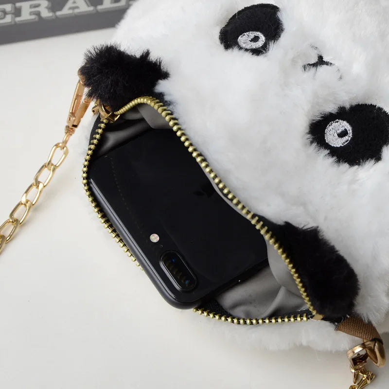 Cute and compact plush panda bag with doll chain, perfect for makeup and change.