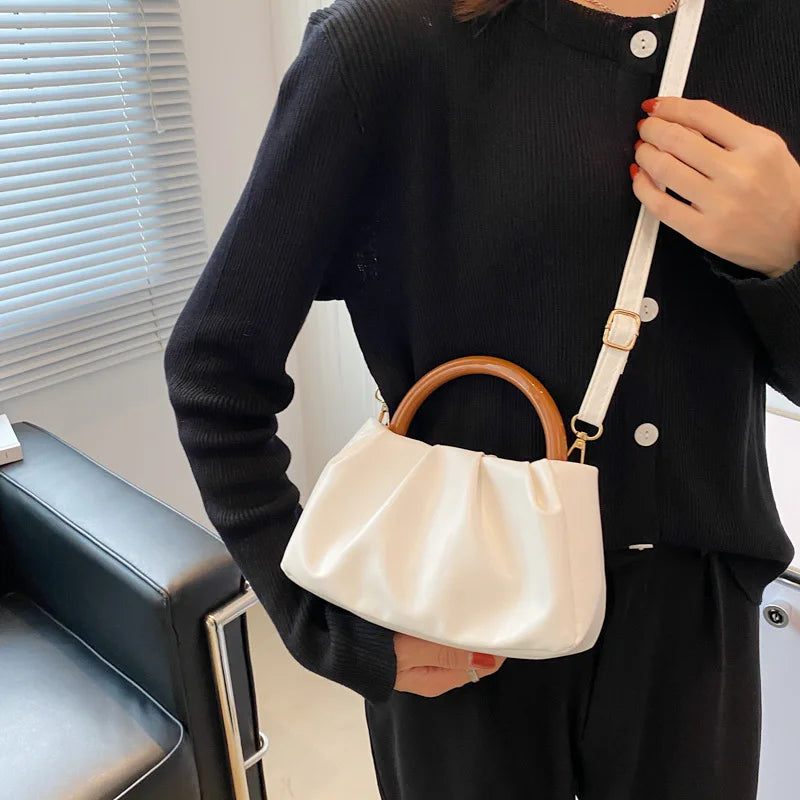 Elevate your style with this chic small handbag featuring a high wooden handle and pleated design. Perfect for leisure outings and shopping.