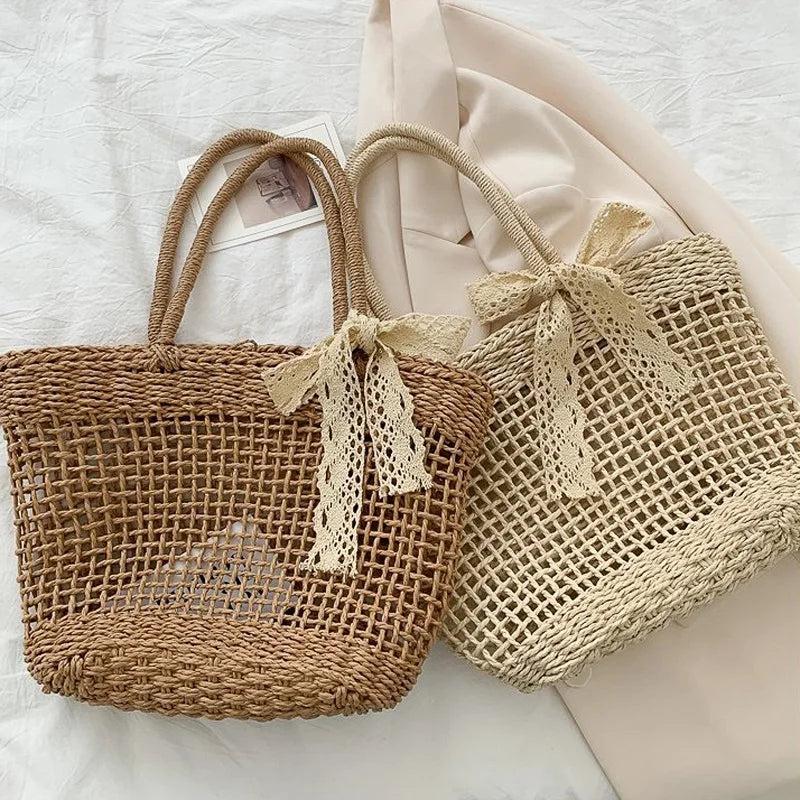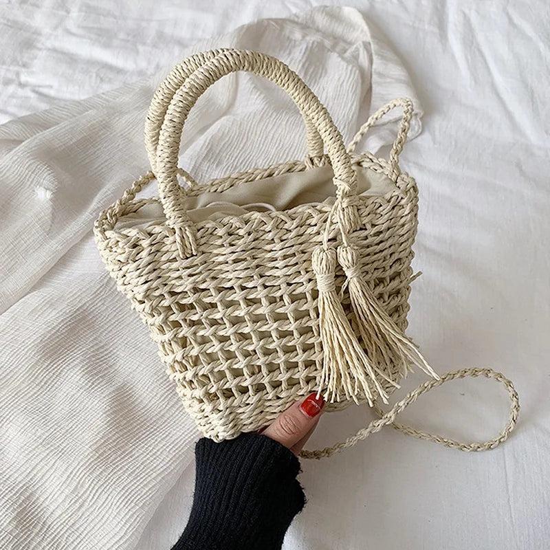 This stylish handbag is perfect for casual outings with its solid color, tassels, and bowknot decoration. It features a hollow braided design and a comfortable handle for easy carrying.