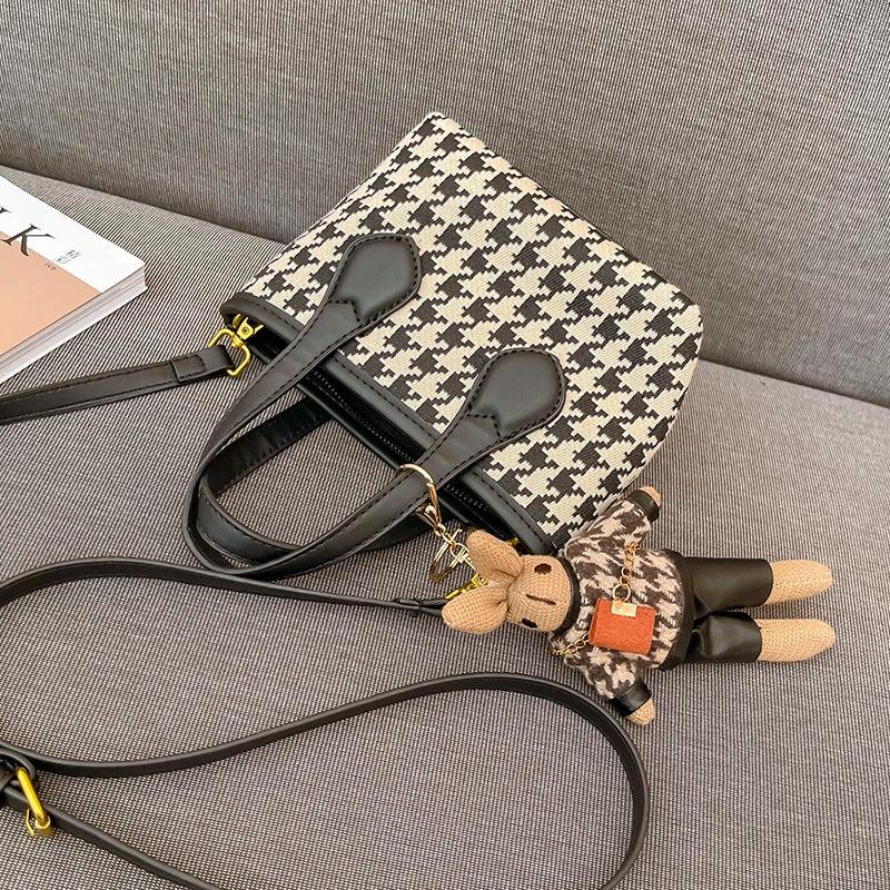 Description:Elevate your style with this houndstooth handbag featuring a spacious design and high-end look. Perfect for carrying all your essentials with ease.Features: Large capacity handbag with houndstooth design High-end and stylish diagonal bucket bag Comes with a bear ornament for a playful touch Ideal for carrying essentials in a fashionable...